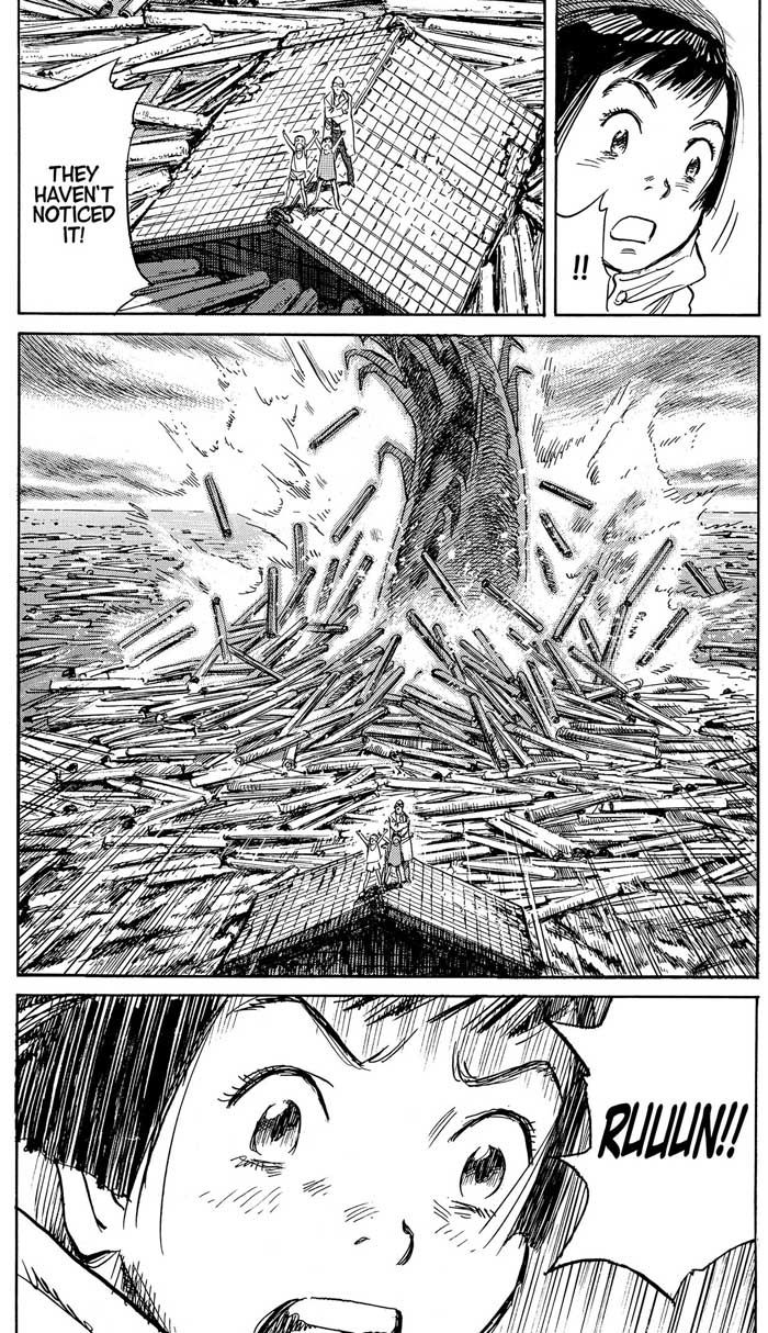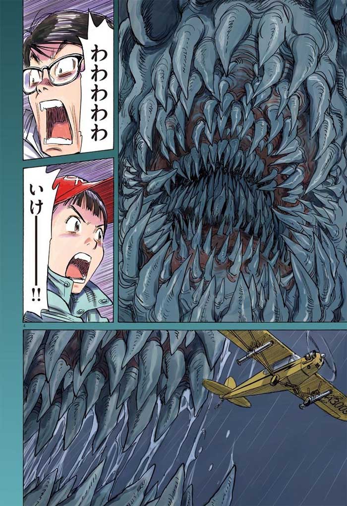 Como desgraça (e referências históricas) pouca é bobagem, em meio a toda essa confissão Nagoya é atingida pelo Tufão Vera – o que ocorreu na vida real em setembro de 1959, causando pelo menos cinco mil mortes e uma destruição enorme, com danos estimados em US$ 600 milhões. Pra sobreviver, Asa se une temporariamente ao sequestrador e, passado o susto, ela acaba descobrindo o próprio destino ao aprender a pilotar um aviãozinho monomotor piper cub, que utiliza para procurar a família e jogar pacotes de mantimentos do alto. Durante o voo, porém, ela vê algo monstruoso saindo do oceano e depois se depara com uma pegada gigantesca.