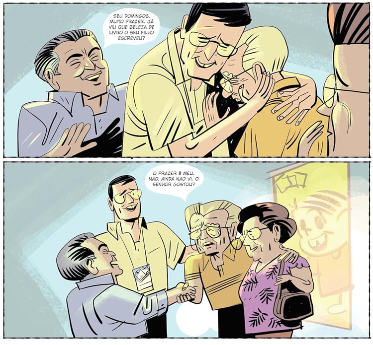 Posteriormente, já mais velho e em um outro capítulo da história, Domingos recapitularia, dizendo ao filho o quanto se orgulhava do trabalho dele. E ainda em outra ocasião se emocionaria ao extremo no lançamento do livro de Gusman sobre Mauricio de Sousa – esta ocasião é mostrada não só nos quadrinhos como em uma das fotos que a obra traz e que mostram alguns dos momentos da HQ “de verdade.”