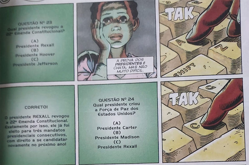Aliás, o presidente dos EUA na HQ, o republicano Erwin Rexall, revogou a 22ª Emenda Constitucional do país para poder ter mais de dois mandatos. O também republicano Donald Trump constantemente vem dizendo que quer um terceiro mandato e que “há métodos para isso.” Será que…?