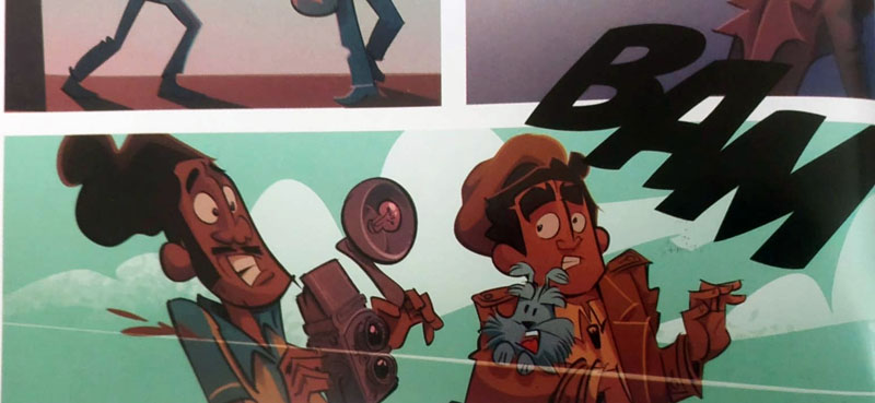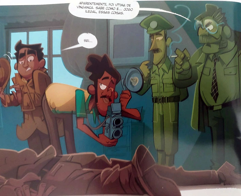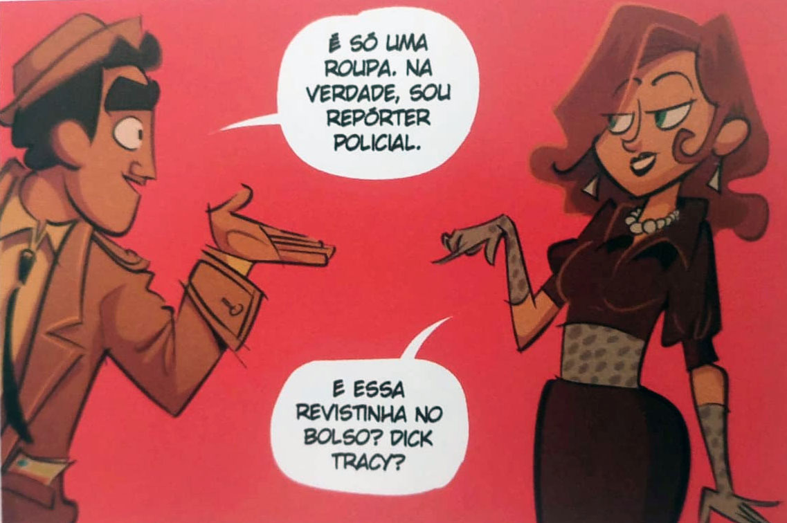 Aliás, é bom alertar desde já que achar todas será praticamente impossível, mas felizmente entre os extras da HQ há um registro dos principais. Algumas referências são mais fáceis de enxergar, como um personagem extremamente parecido com um dos criados por Mauricio que atende pelo nome de “goiabada” – além das roupas idênticas, a brincadeira entre o nome e um tipo específico do doce deixa tudo bem visível. Leitores de The Spirit, de Will Eisner, também verão uma bela homenagem ao mestre logo no começo da HQ.