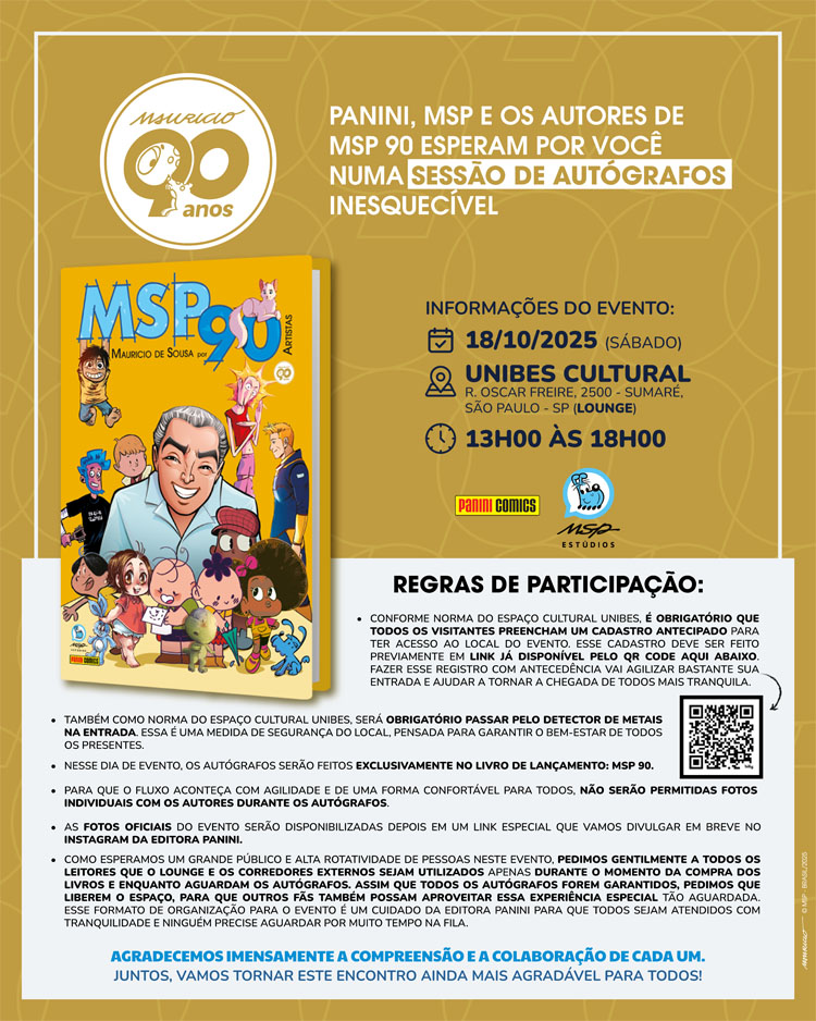“Como neste 27 de outubro o Mauricio completa 90 anos e a gente ama uma festa, eu propus pra Panini e pra MSP pra fazer uma coletânea com 90 autores e autoras de quadrinhos do Brasil inteiro fazendo releituras dos personagens clássicos dele. É um presentaço pro Mauricio e pra todo mundo que ama quadrinhos. São 75 histórias, cada uma com três páginas, sendo 15 delas feitas em dupla pelos artistas”, diz Sidney Gusman, editor da MSP e idealizador do projeto.