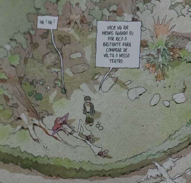 Castor, por sinal, era um trambiqueiro que vivia atrás de dinheiro fácil e aqui ele acha um mapa do tesouro, que gera mais duas referências bem inteligentes à tirinha original. Em determinado momento, ele diz à irmã que se ela financiar a empreitada e ele tiver sucesso, ambos poderão recomprar o “Teatro Timble.”