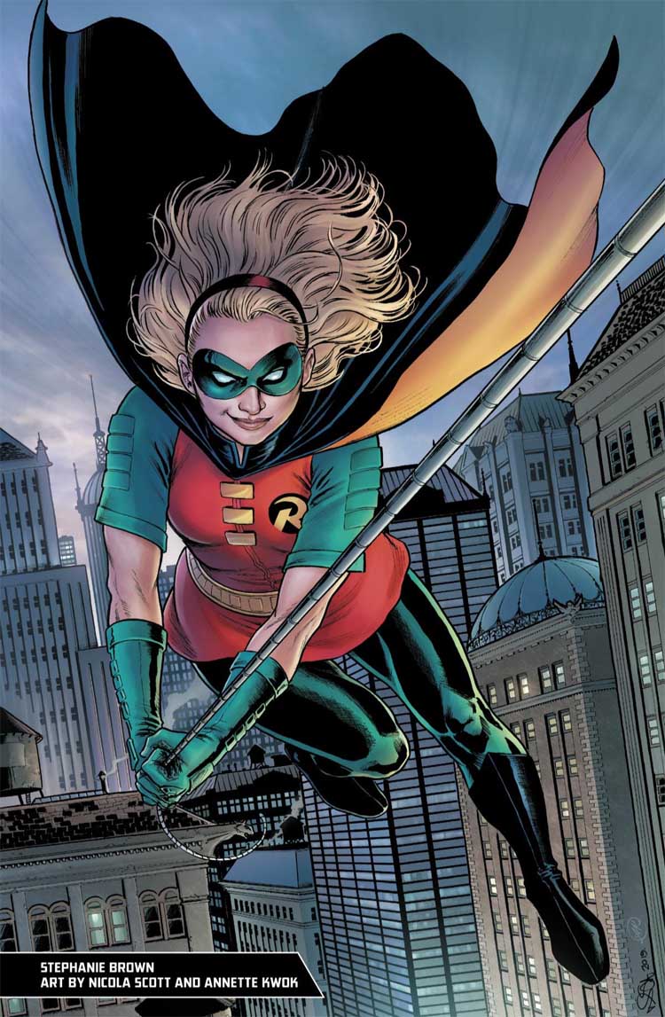 Stephanie Brown atuou como Robin por apenas quatro meses, em 2004. A personagem foi criada bem antes, em 1992, como filha de um inimigo do Batman, o Mestre das Pistas. Porém, diferentemente do pai, ela começou a agir como uma vigilante de Gotham City, com o nome de Salteadora. Stephanie namorou Tim Drake por um período, sem saber que ele era o Robin (o que acabou sendo revelado a ela pelo Homem-Morcego).
