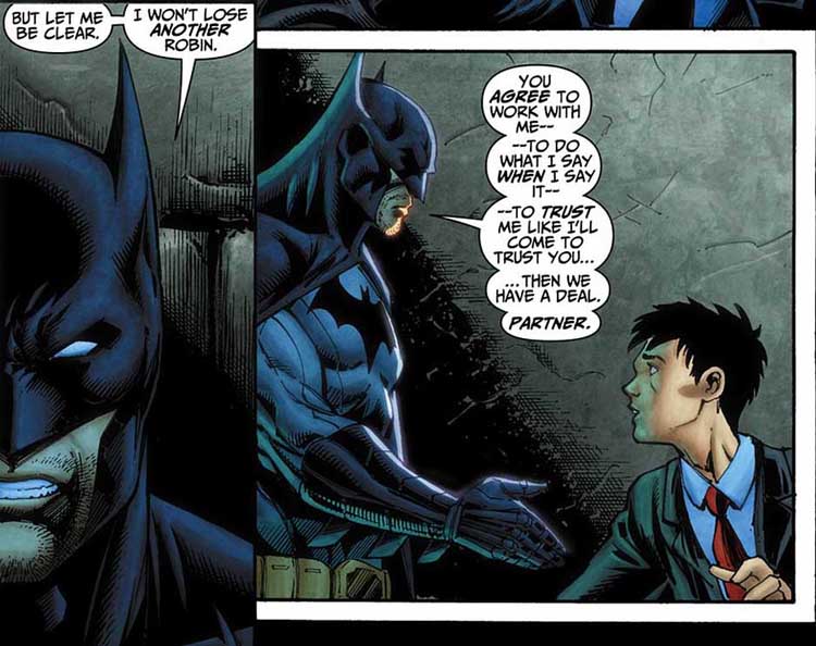 A tônica entre os dois personagens rende HQs interessantíssimas, nas quais aos poucos o menino vai se aproximando do pai e questionando as convicções que foram incutidas nele. Desde o começo, Damian é um lutador extremamente letal (mais do que todos os Robins anteriores), inteligente. destemido e arrogante. É também uma criança e, como tal, bastante imaturo.