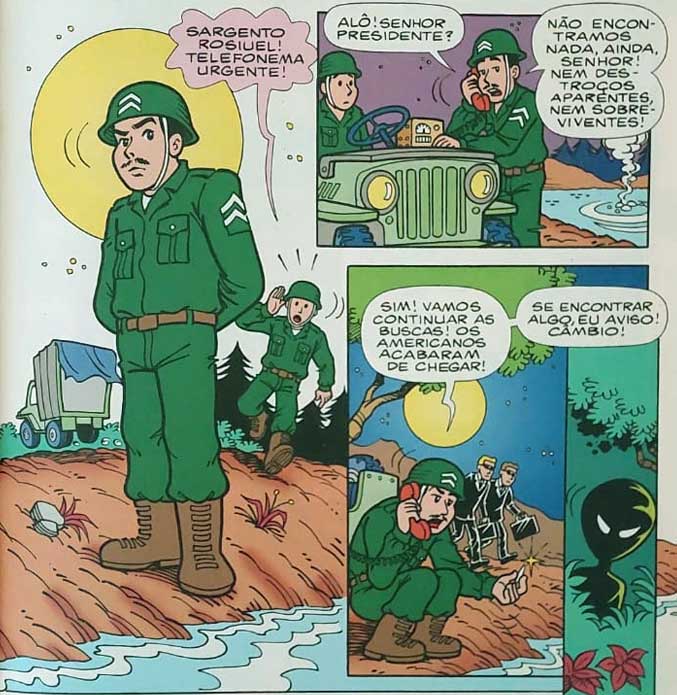Diga-se de passagem, não faltam teorias da conspiração (inclusive importadas): o terreno da represa onde na HQ foi visto o Ovni, por exemplo, acaba interditado pelo exército estadunidense e é chamado de área 48 – porque surgiu antes da famosa área 51 nos EUA, onde supostamente houve um pouso alienígena. Em tempo, não à toa o militar brasileiro que chega primeiro ao local se chama “Rosiuel”…